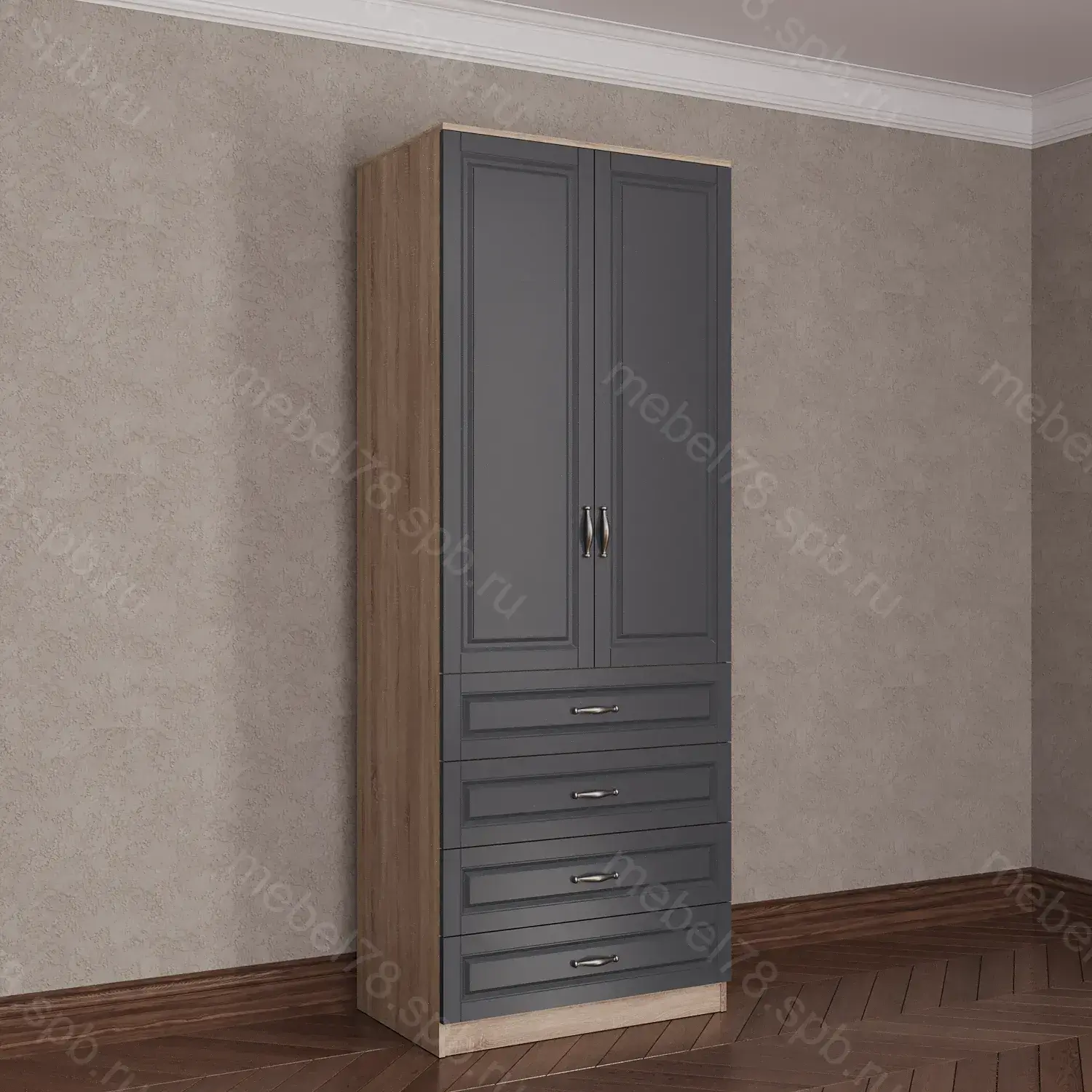 Фасад: Мадес серый; Корпус: Дуб крафт белый